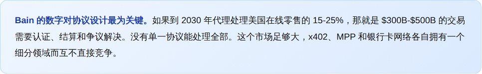 Morgan Stanley 低端估值($190B)和 Gartner 的 B2B 數字($15T)之間差了兩個數量級。這個差距不是混亂,而是口徑不同。Morgan Stanley 統計的是美國消費電商,Gartner 統計的是全球 B2B 採購。即便是最保守的估算下限,也代表了一個比 Stripe 2023 年全年處理量(1 兆美元)還大的市場。
