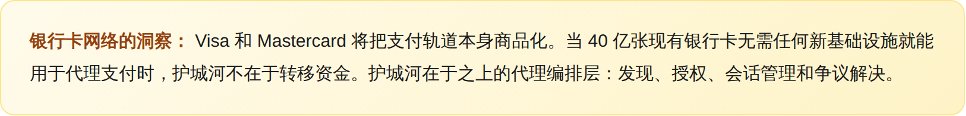 Visa 的 Intelligent Commerce 平台在線時擁有 100 多個合作夥伴,包括 Samsung、Perplexity 和 Microsoft。核心創新是 token 化的 Agent 憑證:一個 Visa 卡號被包裝成具有消費限額、商戶限制和即時監控功能的 Agent 專用 token。Visa 每年處理 14 兆美元,它不需要發明一條新的支付軌道。