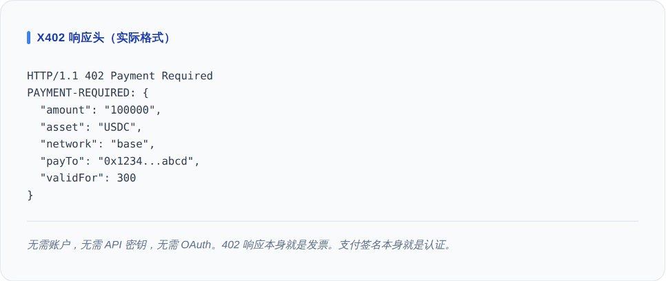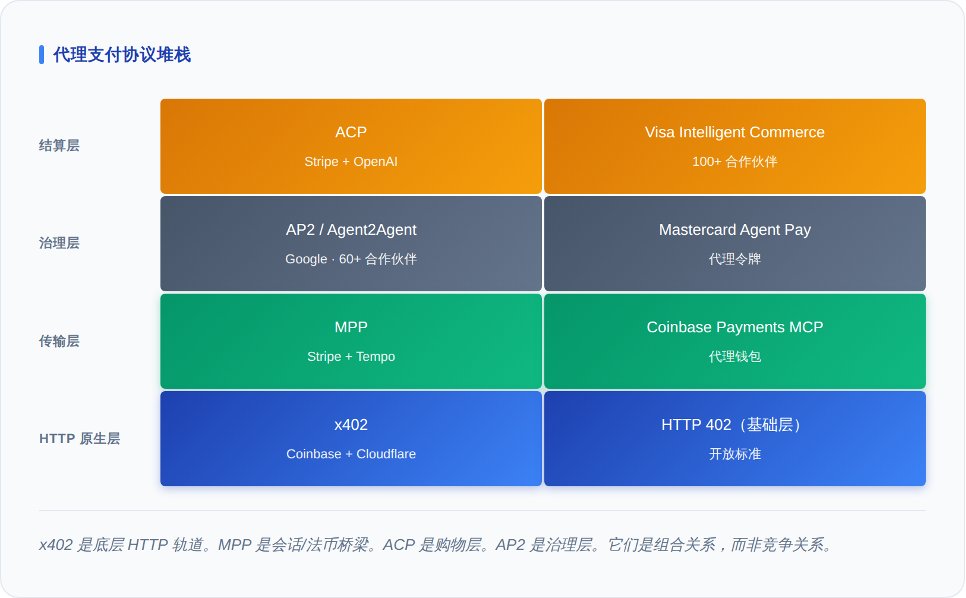 弱點是結構性的。x402 僅支援加密貨幣,沒有法幣路徑。一個需要用企業信用卡支付 SaaS API 的 Agent 無法使用 x402。而且其背後的 Coinbase 平台正處於過渡期。