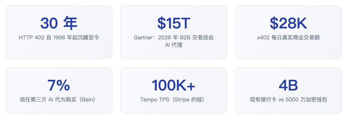 這不是假設。Gartner 預測到 2028 年將有 15 兆美元的 B2B 採購透過 AI Agent 完成。ChatGPT 擁有 9 億週活躍使用者(2026 年 2 月)。當這些使用者將購買決策委託給 Agent 時,Agent 需要一種支付方式。兩家公司正在鋪設軌道:Coinbase 的 x402 和 Stripe 的 MPP。兩者都啟用了自 1996 年以來一直沉睡在 HTTP 規範中的同一個狀態碼,除此之外再無共識。