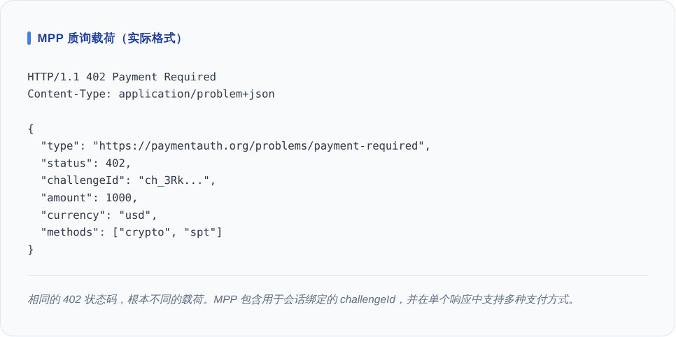 MPP 在單一協議中支援 USDC、信用卡、簽帳金融卡、先買後付和數位錢包。一個用 Base 上的 USDC 付款的 Agent 和一個用企業 Visa 卡付款的 Agent 存取的是同一個端點,收到的是同一張收據。大多數企業採購仍然透過銀行卡運行。一個強制只用加密貨幣的支付協議,是大多數 CFO 不會批准的協議。