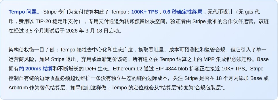 MPP 的底層是 Tempo,一條於 2026 年 3 月 18 日啟動的專用區塊鏈。規格:100,000+ TPS,0.6 秒終局性,無 token 設計(無 gas token,無原生加密貨幣)。驗證者由 Stripe 批准的合作夥伴營運。權衡是明確的:Tempo 犧牲去中心化來換取吞吐量、成本可預測性和監管合規。Stripe 對此毫不掩飾。