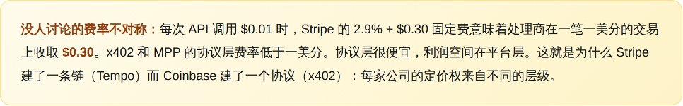 弱點也很真實。Tempo 是一條新鏈,除 Stripe 之外沒有生態。加密貨幣接受在上線時僅限美國。該協議對 Stripe 基礎設施產生硬依賴。而且 MPP 的會話模型引入了狀態,這意味著 x402 的無狀態設計所避免的故障模式:會話過期、部分結算爭議、授權 token 管理。