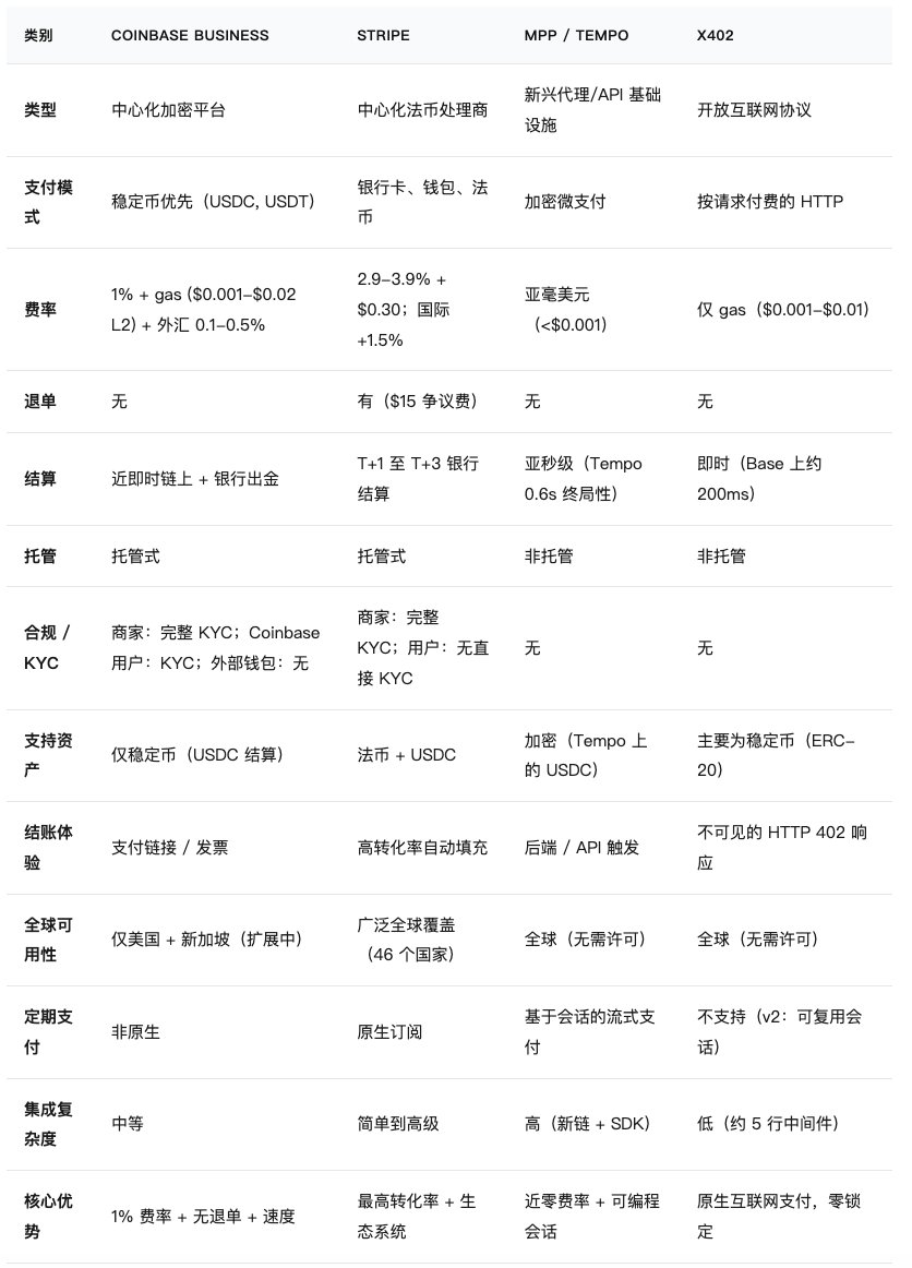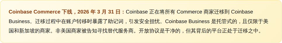 Commerce 在 3 月 31 日下線,Coinbase Business 是託管式且僅限於美國/新加坡,結算自動將所有 asset 轉換為 USDC。開放協議是乾淨的,但其背後的平台正處於遷移之中。