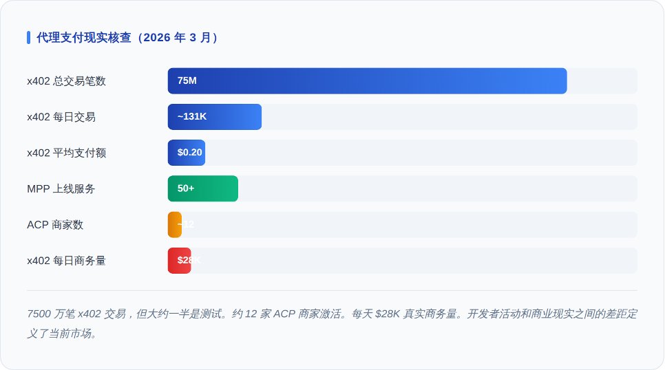 截至 2026 年 3 月的鏈上資料:每日約 131,000 筆交易,每日約 $28,000 交易量,平均支付 $0.20。CoinDesk 的法證分析(2026 年 3 月 11 日)估計大約一半是開發者測試和整合探測。年化總交易量約 1000 萬美元。剔除測試後的年化真實商務量約 500 萬美元。對於一個由 Coinbase、Cloudflare、Visa 和 Google 背書的協議來說,這是種子期指標。協議可行,市場尚未到來。