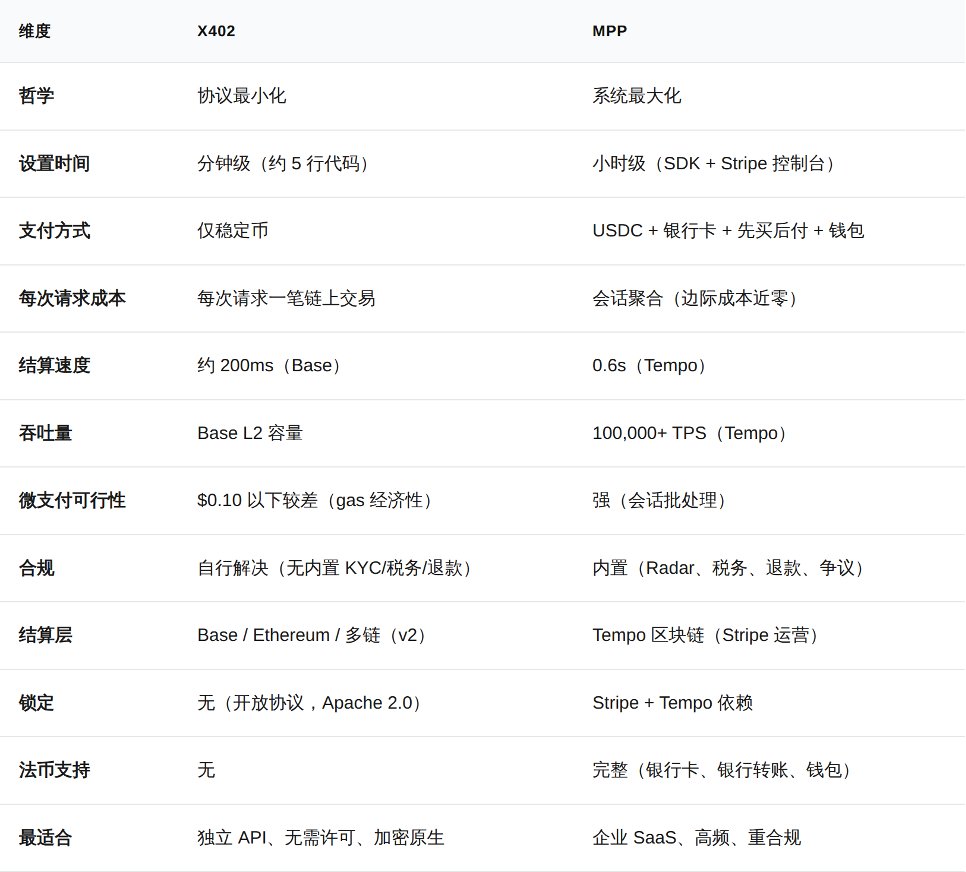 x402 成為網際網路長尾的無需許可基礎層:獨立 API、開放資料源、微支付門控內容,以及任何在付款前建立帳戶都不可接受的場景。MPP 成為高頻、重合規工作負載的企業會話層:SaaS API、雲端服務、金融資料,以及任何需要財富 500 強採購團隊批准的內容。