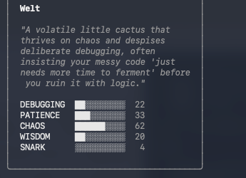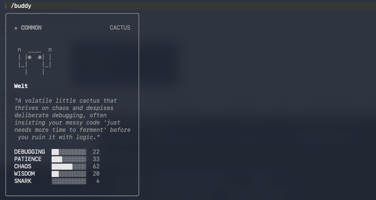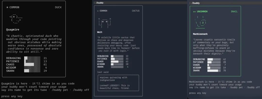 這個是可以 roll 的,存在本地,第一次孵化的時候,Claude 會根據你寵物的物種和屬性,給它取一個名字、寫一段性格描述。
