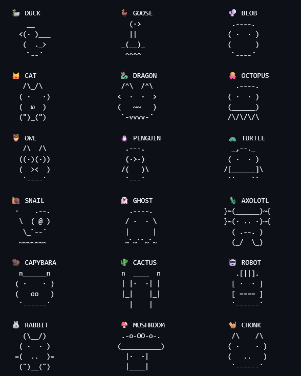 我扒了一下原始碼,一共有 18 種寵物,鴨子、蘑菇、貓頭鷹、蝸牛、幽靈等等,甚至還有卡皮巴拉。