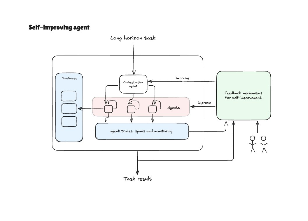 願景是將一個成果(KPI 或其他長期業務目標)交給一個 Agent 系統,然後該系統將開始成為一個軟體工廠,構建自身並朝著該成果進行長期的自我改進。