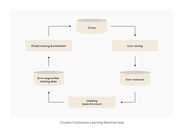 當我在 Cruise 從事自動駕駛汽車工作時,願景是「持續學習機器」(Continuously Learning Machine, CLM) 的概念。目標是讓汽車四處行駛、收集經驗,然後進行改進,這指導了所有工程團隊的努力。