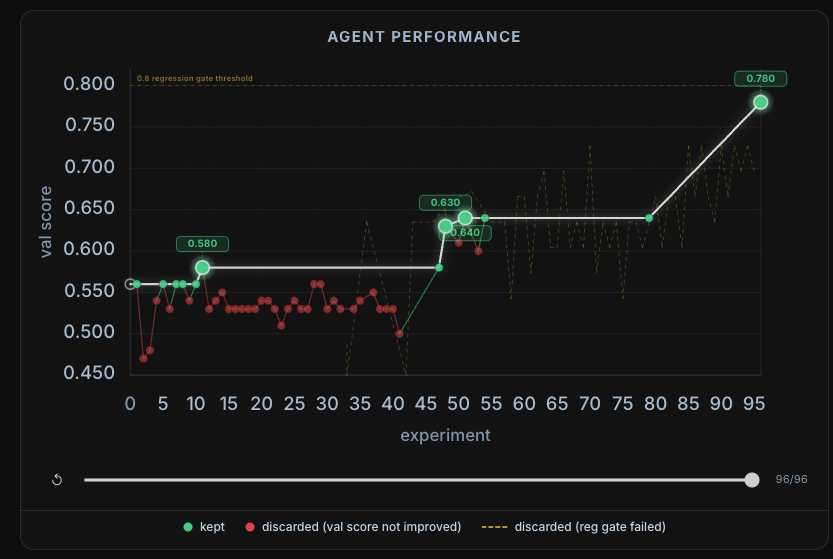 我們在 Tau3 基準測試任務中展示了我們的 auto-agent harness 優化系統,Agent 的分數從 0.56 提升至 0.78(約 40% 的成長),同時挖掘失敗案例並自動維護即時評估。