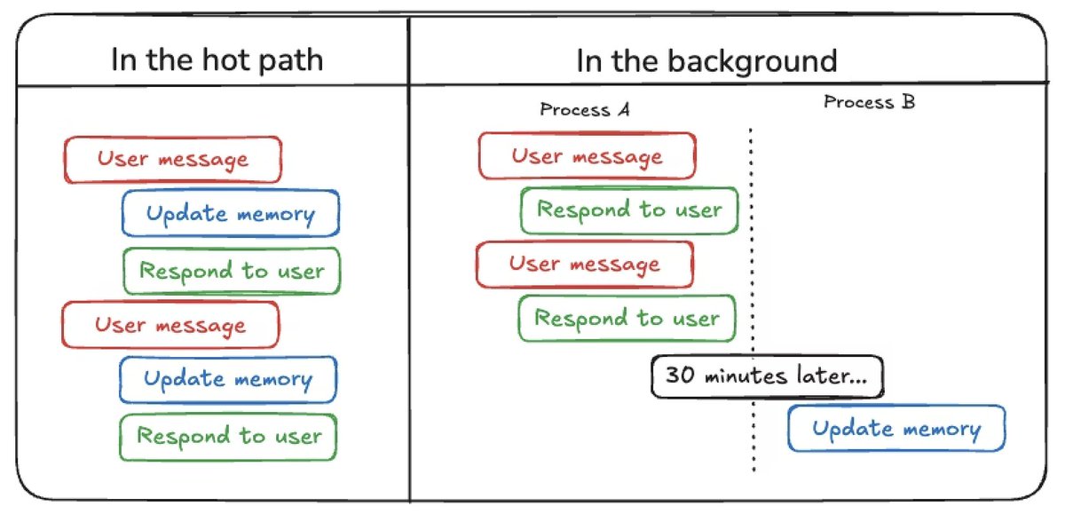 Agent 運行時的熱路徑 (hot path):Agent 可以決定(或者使用者可以提示它)在執行核心任務時更新其記憶。