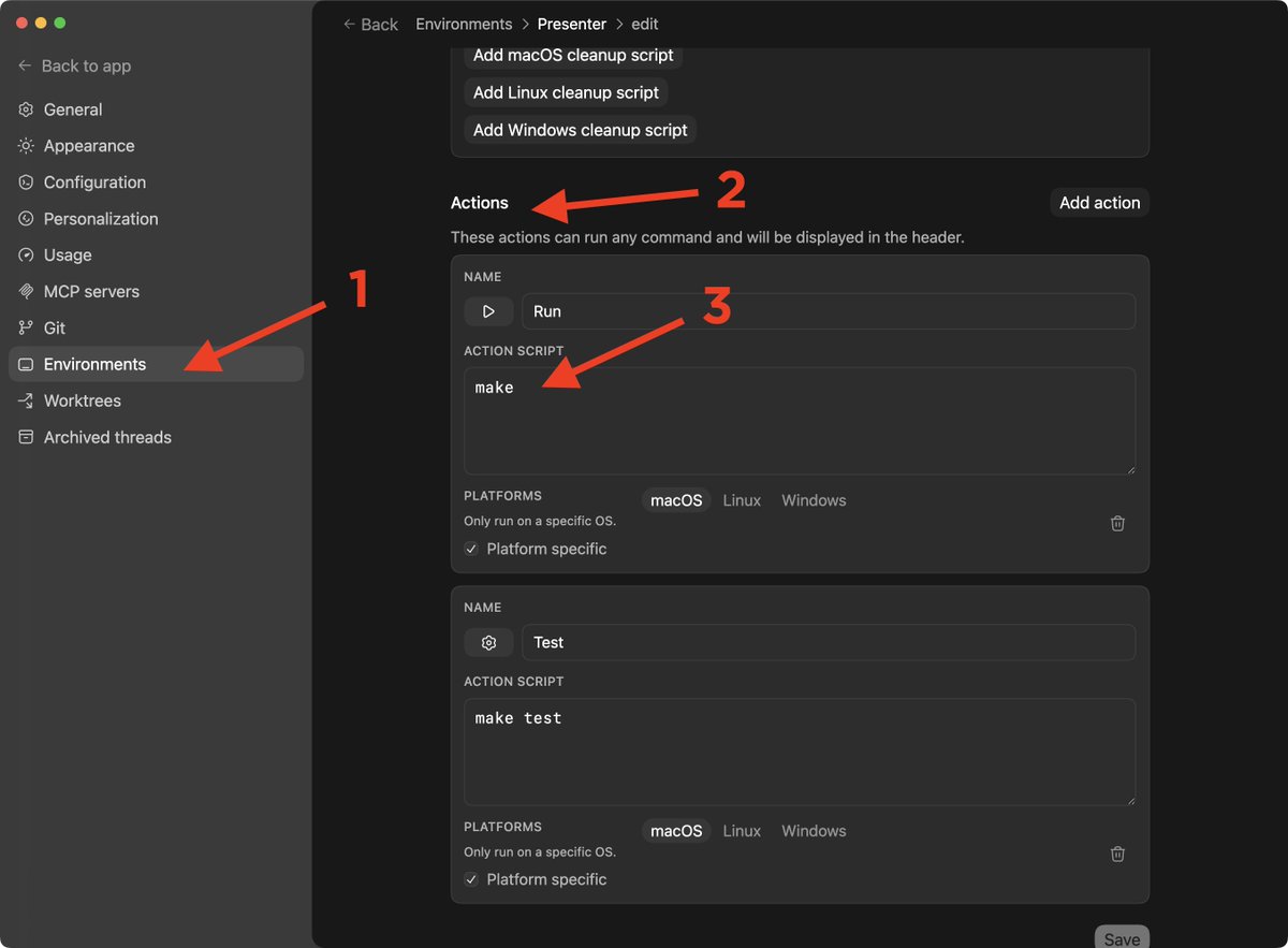 在 Codex 應用程式中,設定自訂執行動作:點擊「Play」按鈕並將其設定為: