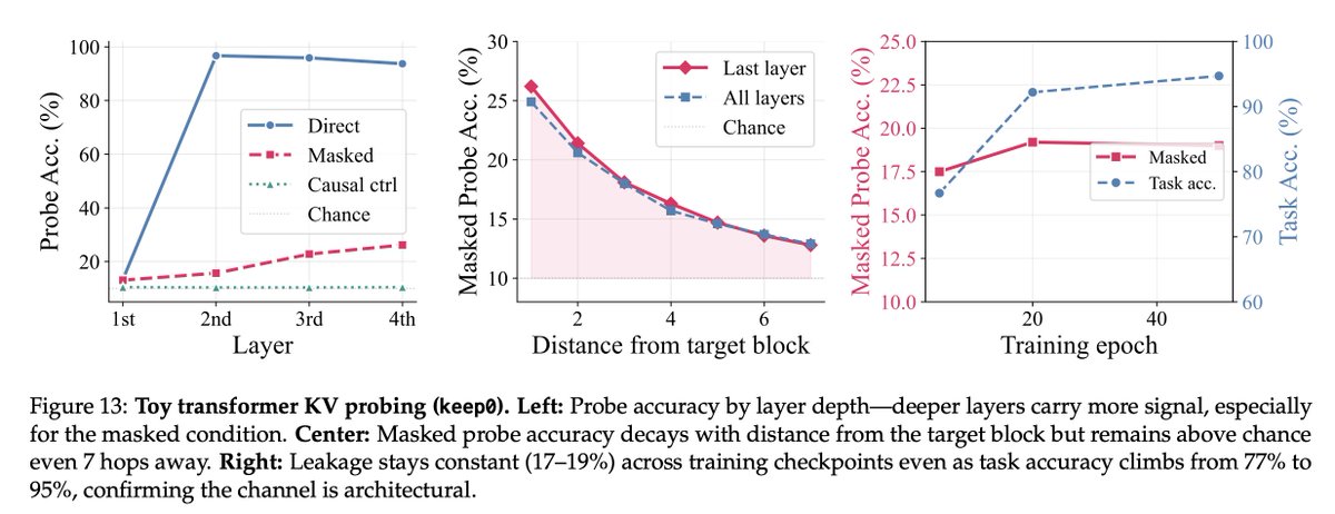 我們還在一個小型受控玩具 Transformer(4 層,810K 參數)上驗證了這一點,其中洩漏在訓練檢查點中是恆定的,即使任務準確度從 77% 提高到 95%。這是殘差連接、因果注意力和就地遮罩 (in-place masking) 的架構後果。
