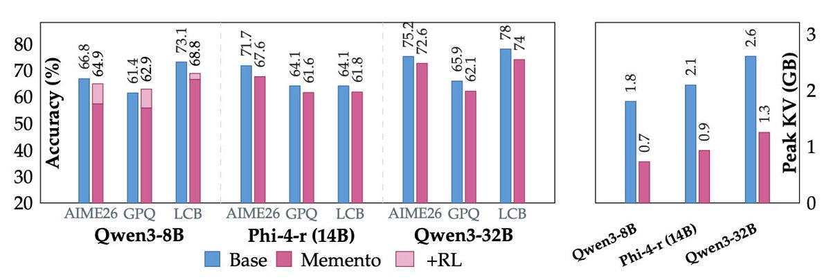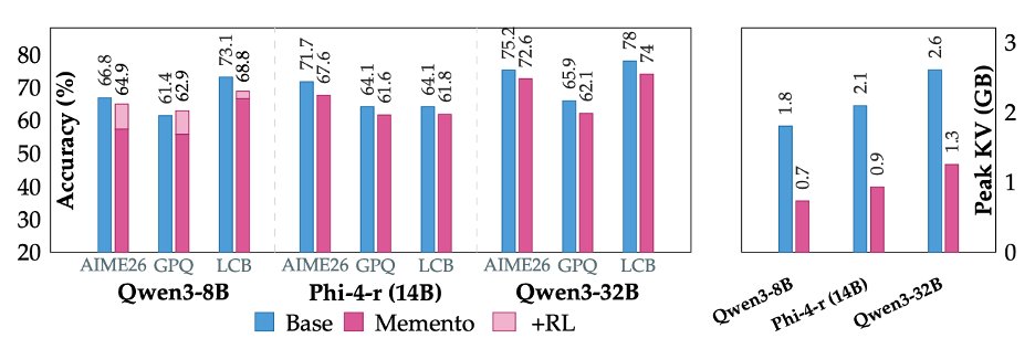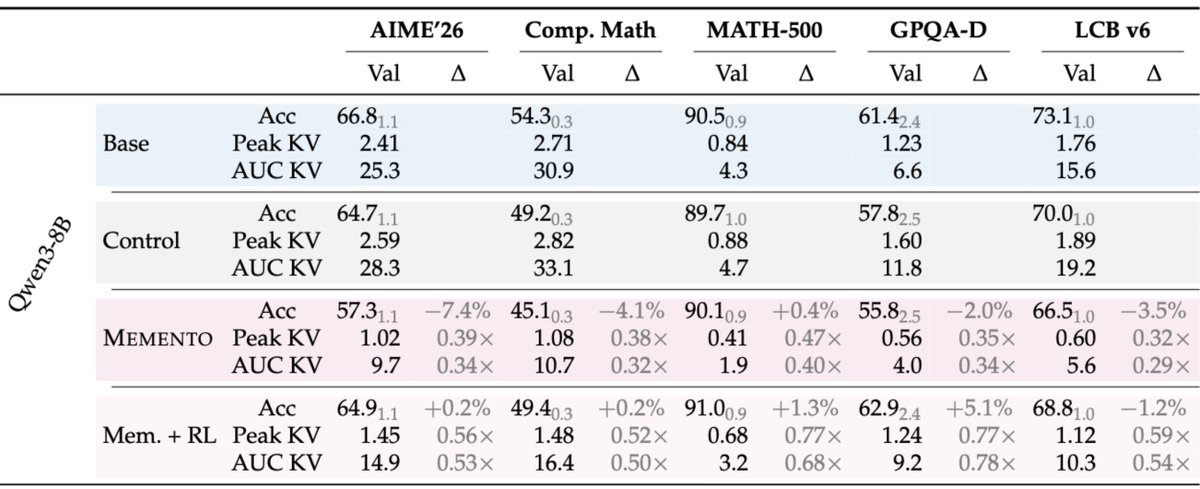 自然的下一步是 RL。不出所料,它有效:使用 CISPO 微調 Qwen3-8B Memento 檢查點可以恢復 AIME'26 和 GPQA-Diamond 的分數(有時甚至超過原始基準),同時在 RL 之後 KV 的節省仍然相當可觀。