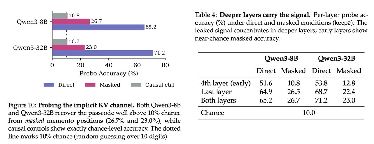 因此,我們設計了一個簡單的實驗:獲取一個模型,將一個隨機的 5 位數密碼注入目標區塊,遮罩該區塊,並對從未直接關注被遮罩區塊的下游 memento 的 KV 狀態訓練線性探針。您能恢復僅存在於隱含 KV 通道中,而不存在於任何 memento 文字中的資訊嗎?