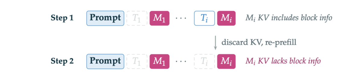 但我們一直回到一個擔憂:當產生 memento 時,模型仍然可以看到完整的思考區塊,因此 memento token 在其自身生成過程中會關注區塊 token。區塊僅在 memento 完成後才被遮罩。這意味著 memento 的 KV cache 條目是作為區塊內容的函數計算出來的。因此,即使在區塊文字消失後,來自區塊的某些內容仍會在 memento 的 KV 表示形式中存活。如果下一個區塊關注 memento,它就是以間接方式關注這種先前內容的隱含、軟性表示。在重新啟動設定中,您會丟棄所有這些內容。