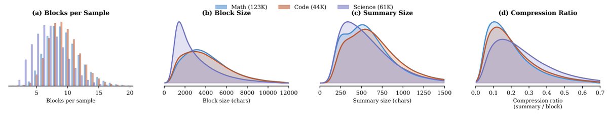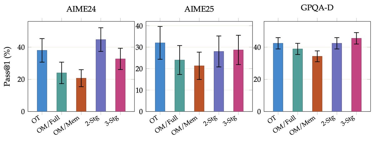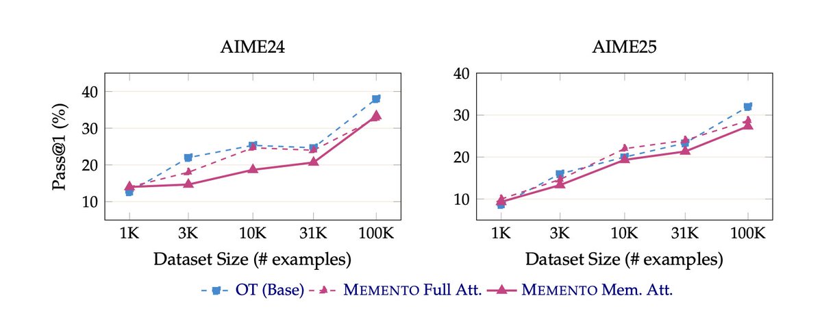 階段 1 使用標準因果注意力,並對所有 token 進行損失計算。模型學習格式:何時結束區塊、如何撰寫 memento、結構看起來是什麼樣子。它仍然可以看到所有內容,因此還沒有壓縮壓力。階段 2 隨後引入硬性限制:在每個 memento 之後,先前的思考區塊會被完全遮罩,不參與後續的注意力計算。現在模型必須產生包含未來推理所需一切內容的 memento,因為原始區塊已經消失。這似乎是真正學習發生的階段:模型被迫將更多資訊打包到 memento 中,就像一種 RL 風格的壓力訊號,推動其進行自包含的壓縮。非常酷!