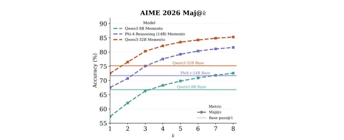 我們教導模型在生成過程中自行壓縮其思維鏈 (Chain-of-Thought)。峰值 KV cache 下降了 2–3 倍,吞吐量幾乎翻倍,且被抹除的推理區塊會在 KV cache 中留下痕跡,供模型持續使用。論文、OpenMementos (228K 軌跡)、資料生成與推論程式碼皆已開源。