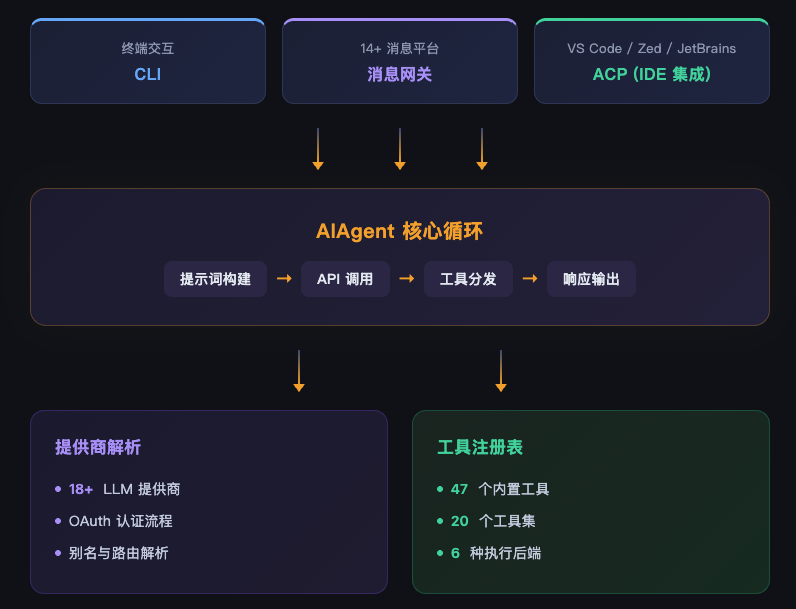 核心是一個統一的 AIAgent 類,所有入口點(CLI、訊息閘道器、IDE plugin)都透過它處理。這意味著無論你從哪個平台發訊息,獲得的能力完全一致。