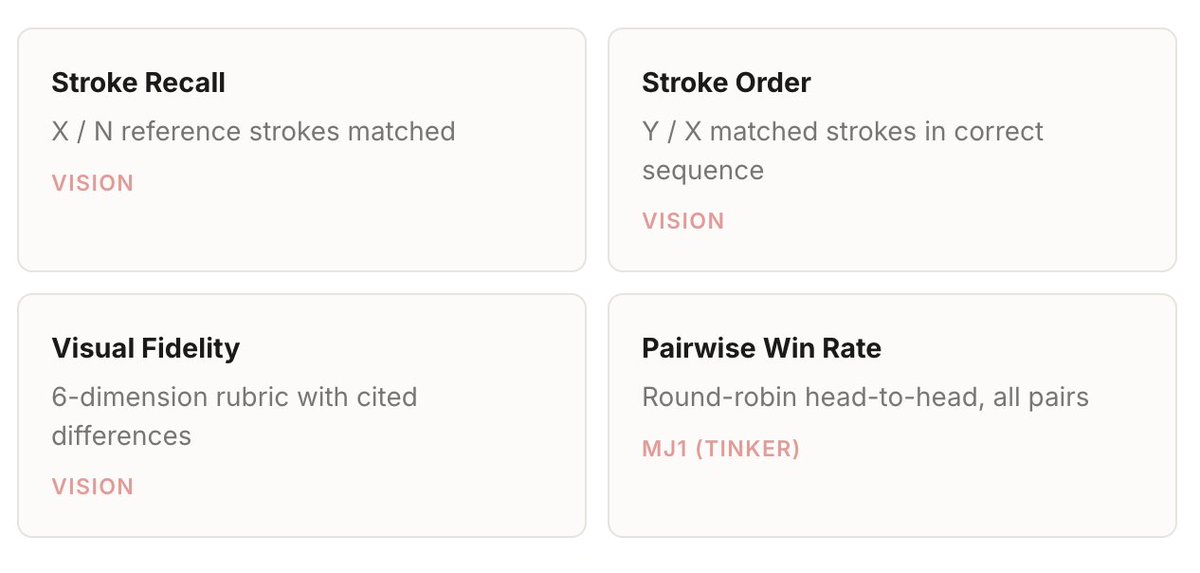 在下方,您可以查看每個模型在所有 88 個漢字上的書寫成果。每一行都展示了參考書法以及每個模型的嘗試,並提供逐筆重播功能。完整的資料集——包括參考影像、模型輸出、評估分數和解碼後的筆畫資料——皆可在 HuggingFace 上取得。