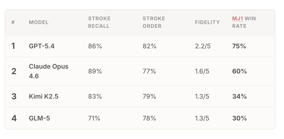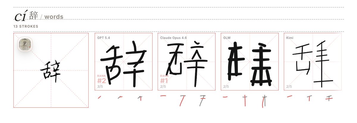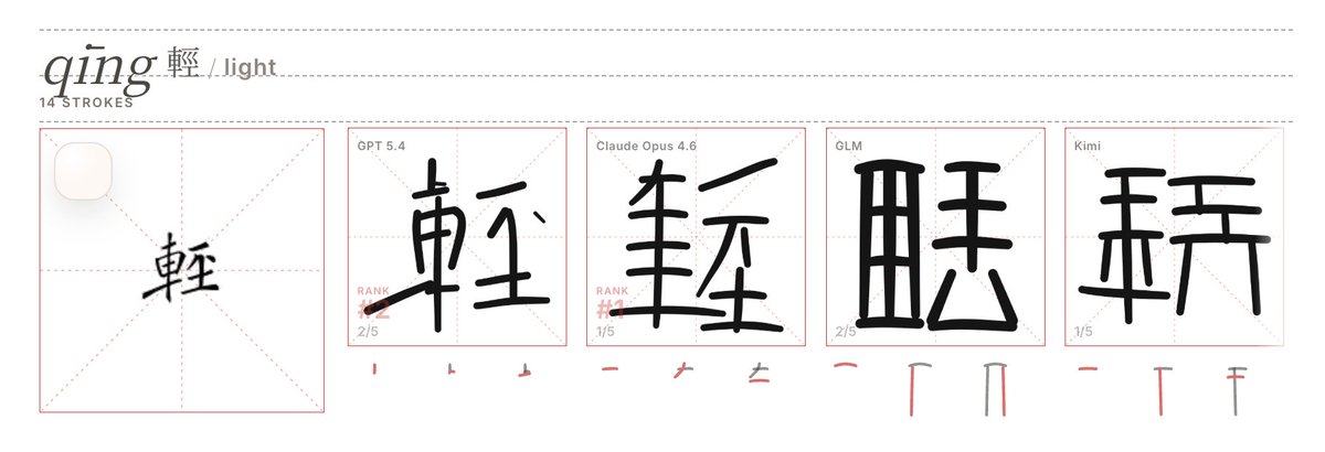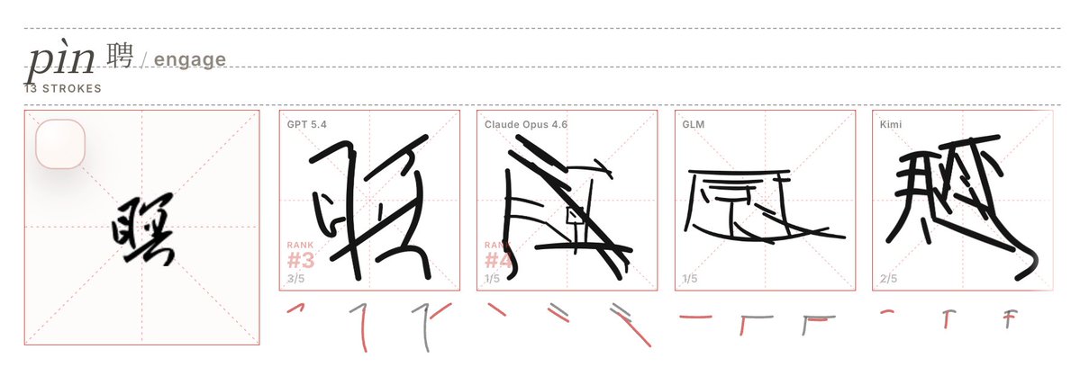 GPT-5.4 以 75% 的兩兩對決勝率領先,其次是 Opus 4.6(60%)、Kimi K2.5(34%)和 GLM-5(30%)。Opus 達到了最高的筆畫召回率(89%),而 GPT-5.4 在視覺保真度(2.2/5)和筆畫順序(82%)上領先。特別是 GLM,有時會誤認其應繪製的漢字,產生幻覺而繪製出與參考影像不同的字。