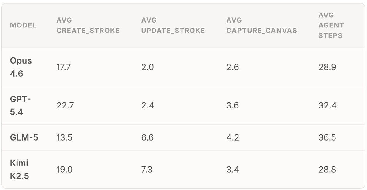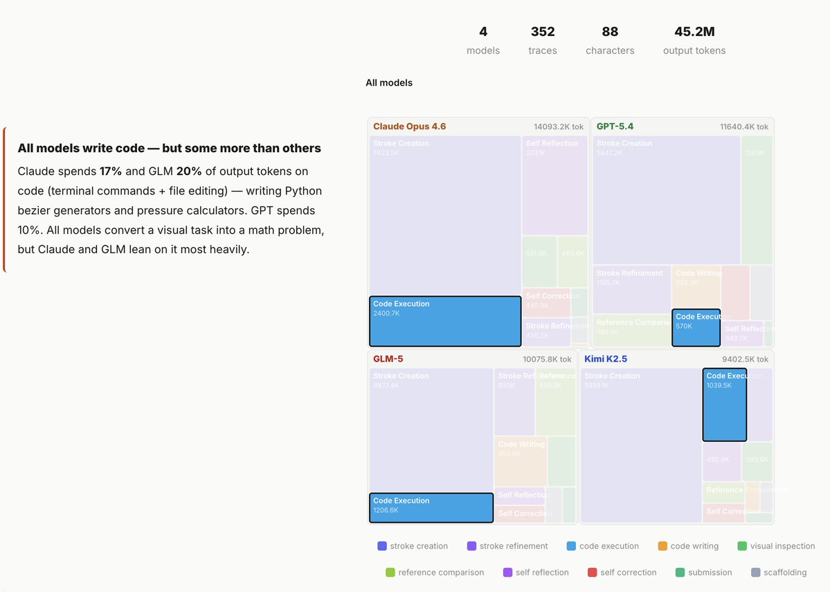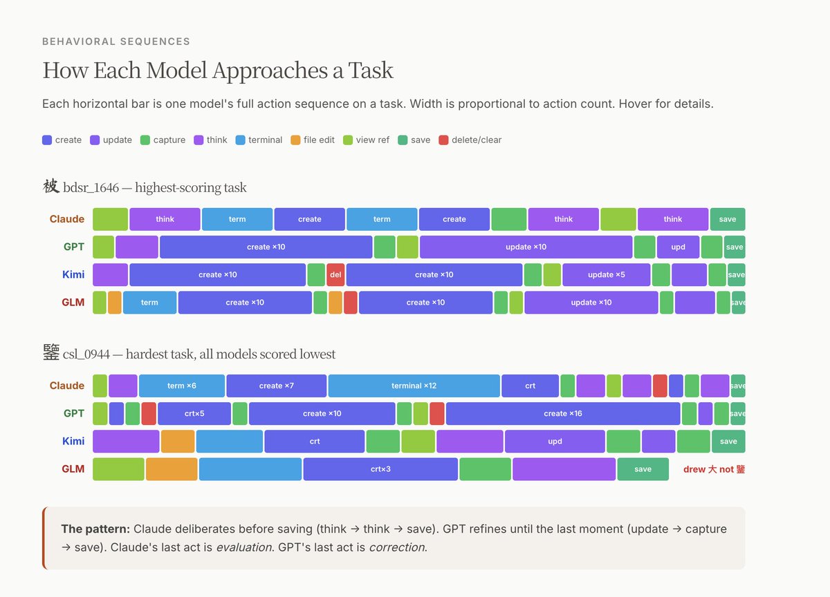 Opus 4.6 每個任務平均僅進行 2.0 次筆畫修訂,顯示其採取「先規劃後執行」的方法。GPT-5.4 每個漢字產生的筆畫最多(22.7 筆),且最願意使用 clear_canvas 並重新開始。GLM-5 採取的 Agent 步驟最多(每個任務 36.5 步),自我檢查最頻繁(每個任務 4.2 次截圖),但產生的筆畫最少(13.5 筆)——花在迭代上的時間比繪畫還多。Kimi K2.5 的 update_stroke 比率最高(每個任務 7.3 次),且在不同任務間表現出極大的差異。