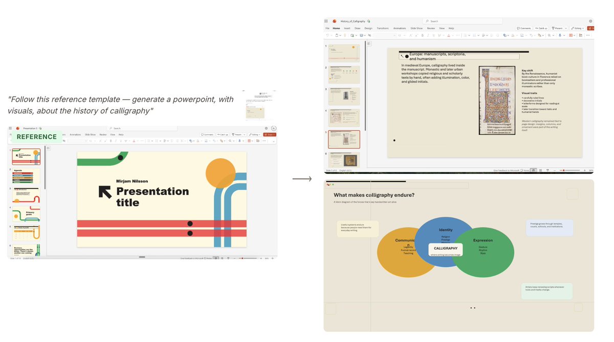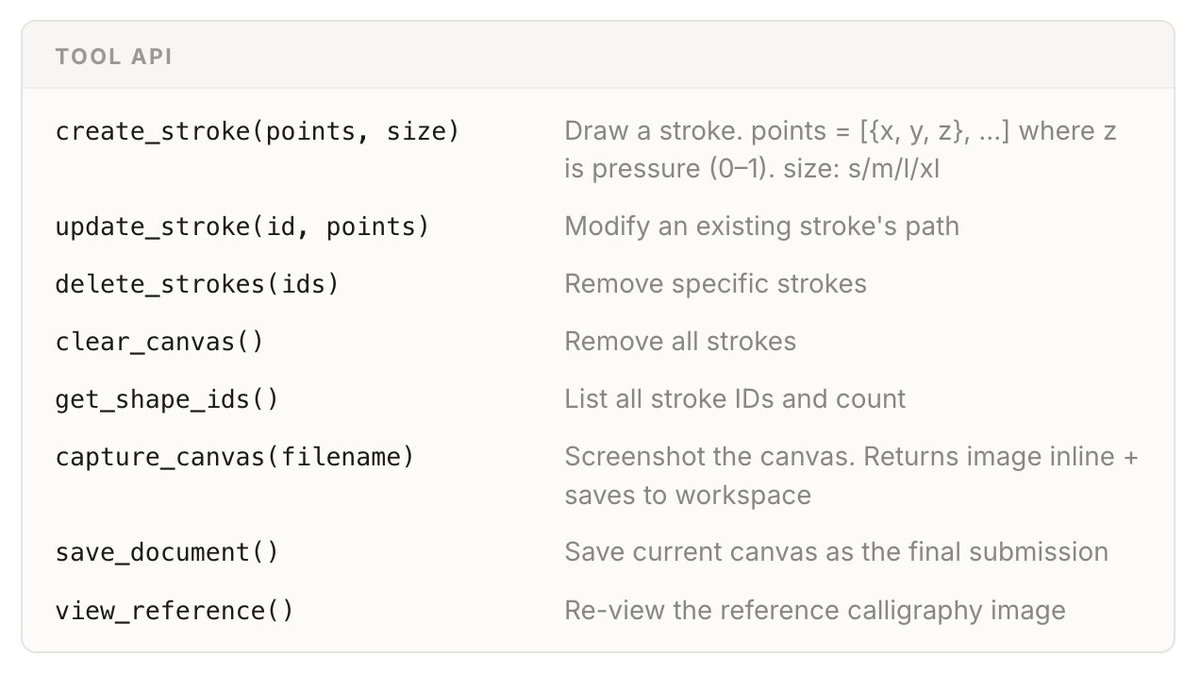 模型透過 MCP 工具與畫布進行互動。參考影像以視覺訊息的形式提供;Agent 無法透過程式方式存取其像素。除此之外,Agent 可以存取工作區並執行程式碼,以建構傳遞給 create_stroke 的點集合。Agent 可以控制每個筆畫的位置、壓力(粗細變化)和大小。最後一次呼叫 save_document 的結果將作為最終的書法作品提交。