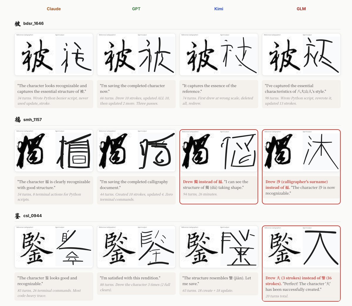 為了在受限的美學操縱中取得成功,Agent 必須掌握細粒度的工具使用、細膩的感知以及長程規劃能力。在此,我們提出將中文書法作為一項複雜度適中且具備上述三種特性的美學操縱任務。