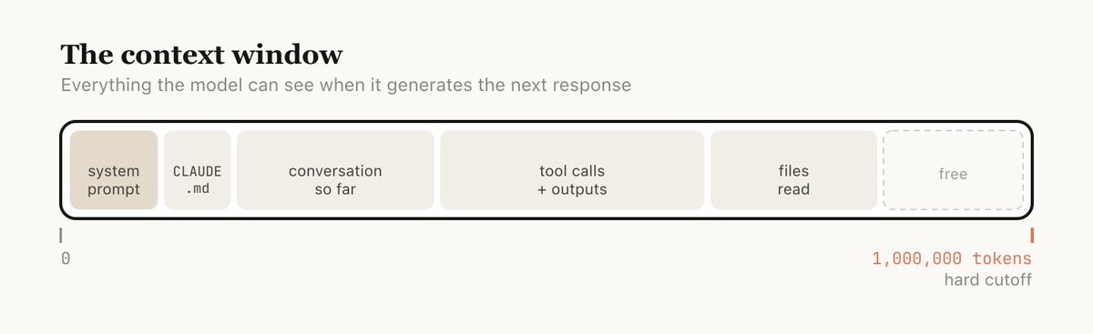 Context window 是模型在生成下一個回應時,能夠同時「看見」的所有內容。它包含了您的系統 Prompt、目前的對話紀錄、每一次的工具呼叫及其輸出,以及所有被讀取過的檔案。Claude Code 擁有 100 萬 token 的 context window。