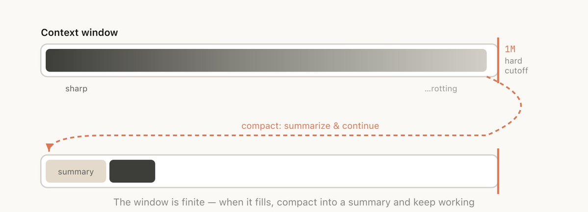 這特別困難,因為受到 context rot 的影響,模型在進行 compact 時正處於最不聰明的狀態。擁有 100 萬的 context,您有更多時間主動進行 /compact,並附上您想要執行的任務描述。