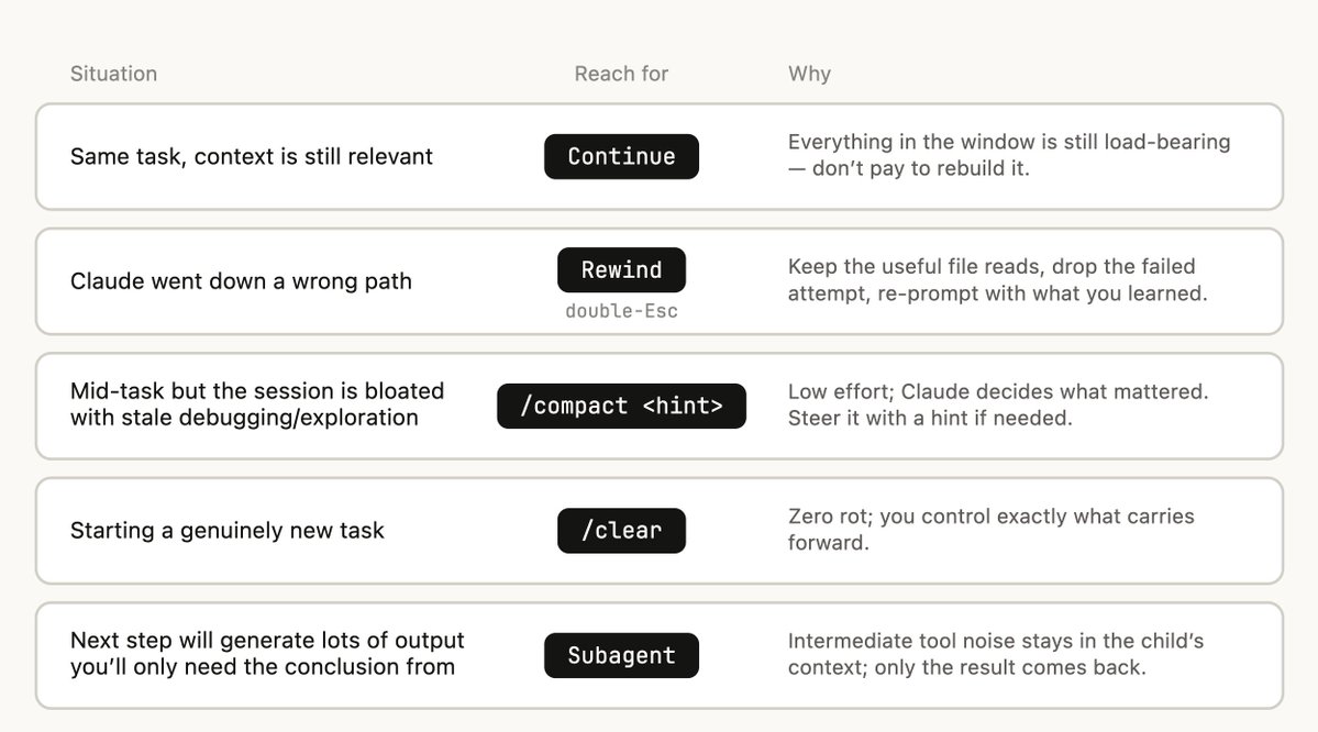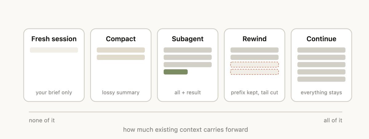 假設您剛要求 Claude 完成某件事,而它已經執行完畢,此時您的 context 中已經有一些資訊(工具呼叫、工具輸出、您的指令),而您接下來有許多選擇: