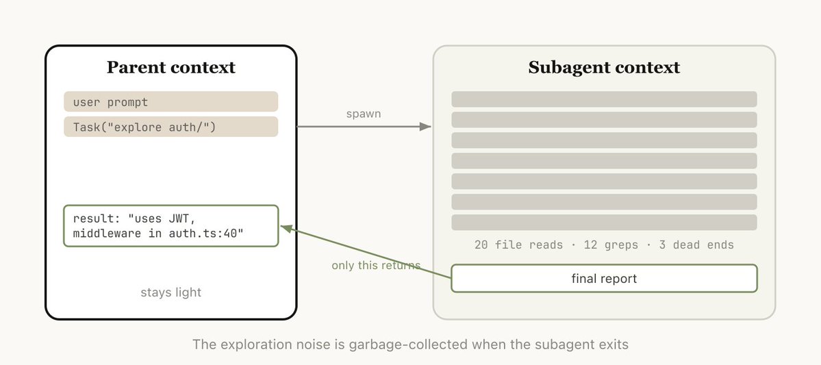 - Subagents — 將下一部分的任務委派給一個擁有獨立乾淨 context 的 Agent,並只將其結果取回
