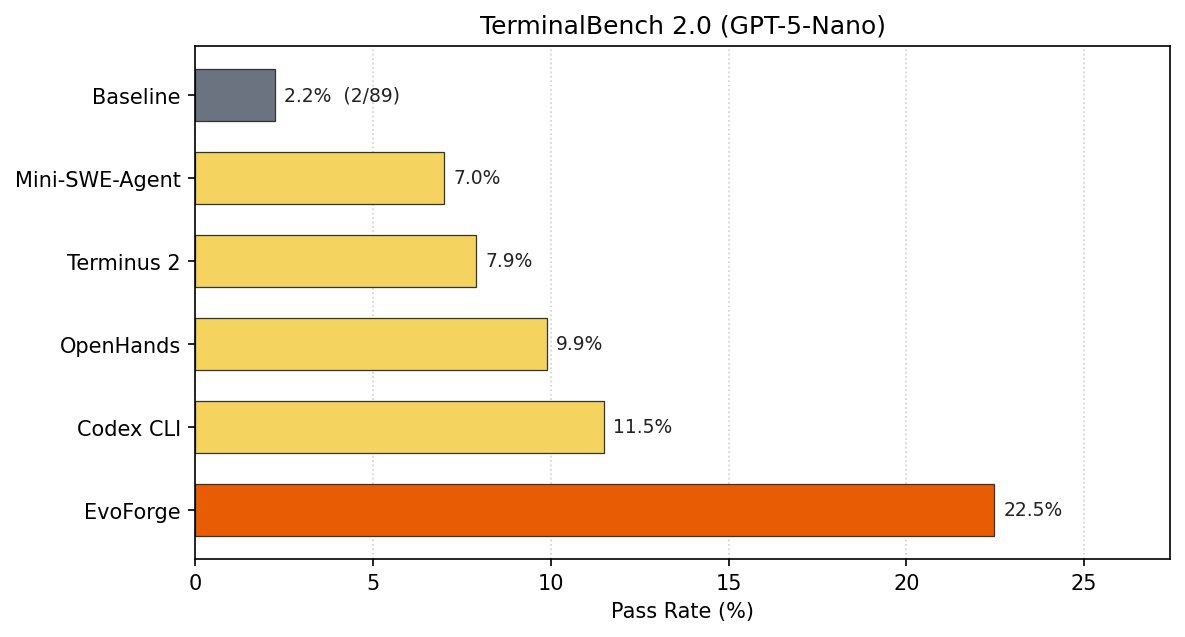 在 TerminalBench 2.0 測試中,EvoForge 將 GPT-5-nano 的 SOTA 效能提升至 Codex CLI 的兩倍,並達到基準測試的 10 倍之多。