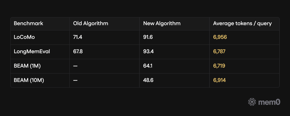 全新的 @mem0ai 記憶體演算法在 LoCoMo、LongMemEval 和 BEAM 測試中達到了極具競爭力的準確度,且每個查詢使用的 token 數不到 7,000 個(約減少了 3–4 倍的 token 使用量),而大多數系統的運作量都在 25,000 個以上。