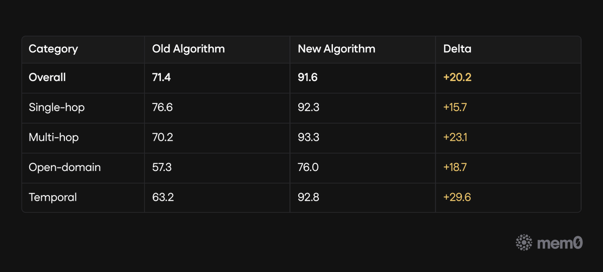 新演算法將提取過程簡化為僅執行一次 LLM 呼叫,且只進行新增操作。每個提取出的事實都成為獨立的紀錄。當資訊發生變更時,新的事實會與舊的事實並存,兩者皆被保留。這將提取延遲大約減少了一半,並產生了更好的記憶,因為模型將運算能力花在理解輸入上,而不是與現有狀態進行差異比對。