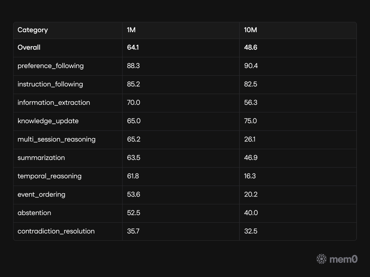 觀察類別細分,該系統在兩個規模下的偏好遵循、指令遵循和知識更新方面都表現良好。這些任務受益於僅新增(ADD-only)架構,能乾淨地保留長期的狀態。在 1,000 萬規模下表現較弱的類別是時間推理、事件排序和多階段推理。這些在整個領域中仍是待解的問題。事實層級和實體層級的匹配對它們來說還不夠。它們需要更高階的表示法來描述事件如何隨時間相互關聯,這也是我們持續研究的重點。