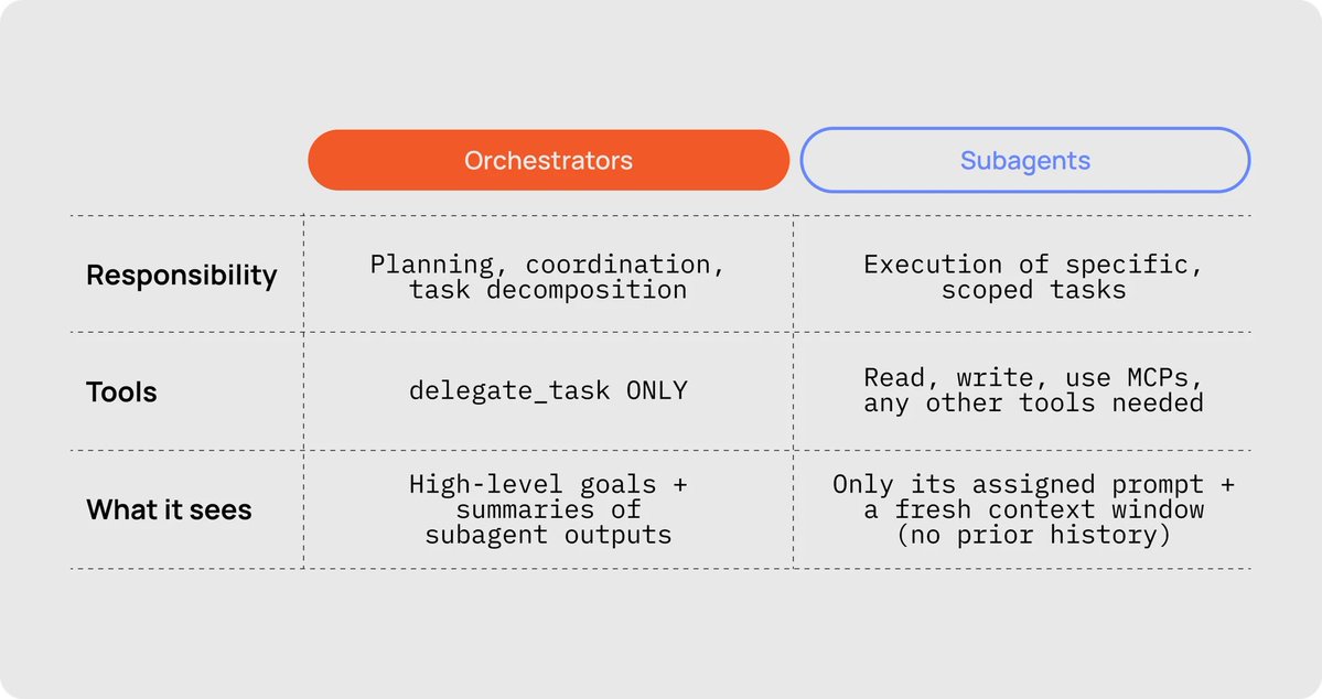 主廚的工作是接收來自人類的訂單,將其拆解成一份可執行的工單列表,然後呼叫廚房助手去完成每一個較小、有範圍限制的工作。Orchestrator 負責規劃、協調和任務拆解。它唯一的工具是 delegate_task,它只能看到高層級的目標以及子 Agent 輸出的摘要。