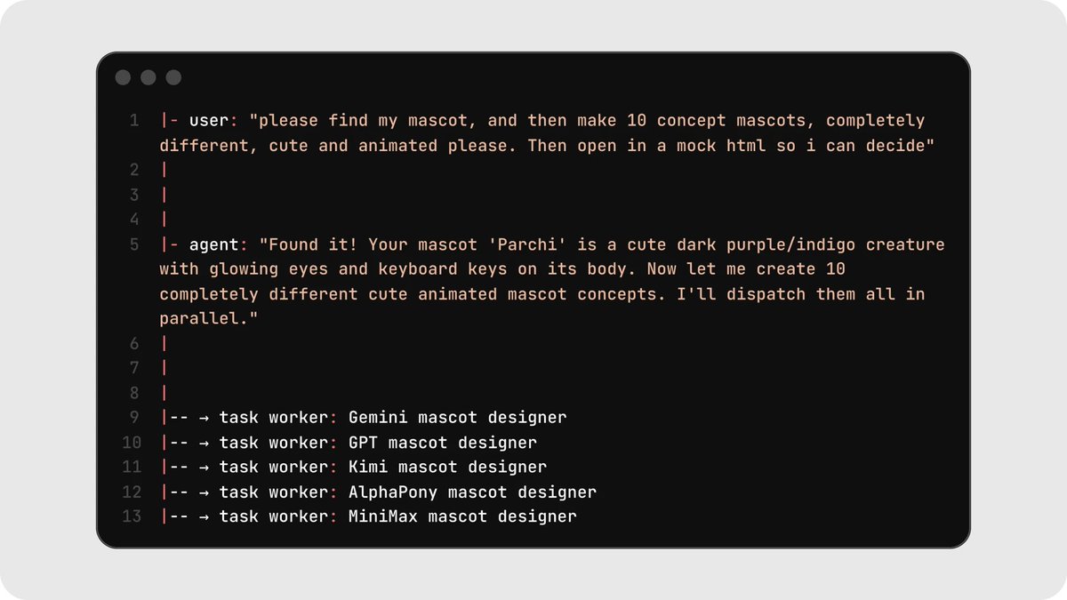舉個例子:我們想為 Parchi 建立 50 種吉祥物變體,所以我們派遣了 5 個 Codex Spark Subagents,每個產生 10 種變體。然後我們挑選出我們喜歡的,剩下的就丟棄。