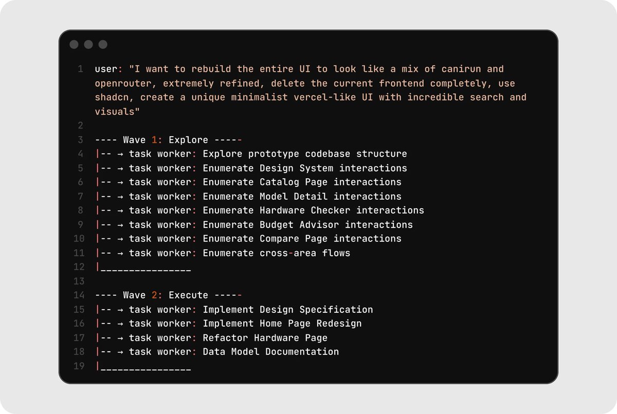 這就是「分階段平行執行」背後的想法。你將專案拆解成套餐(或「波次」),其中每一道菜都嚴格依賴於前一道菜。在每一道菜內,任意數量的任務和廚房助手都可以平行運行。這非常適合較大的專案,例如完整的應用程式重構或大型重構。
