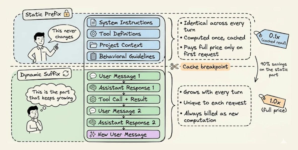 核心概念很簡單:建構你的提示詞,讓靜態內容位於上方,動態內容在下方增長。基礎設施會對前綴進行雜湊處理,儲存 KV 張量,並為你隨後的每次讀取提供 90% 的折扣。
