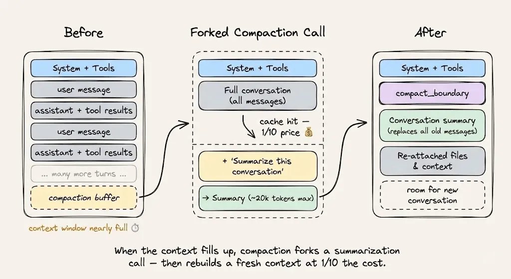 當你接近 Context 上限需要進行 Context 壓縮時,請使用「快取安全的分叉」(Cache-safe forking)。保持相同的系統提示詞、工具和對話歷史,然後將壓縮指令作為新訊息附加在後面。這樣快取的前綴會被重複使用,唯一會被計費的新 token 只有壓縮指令本身。