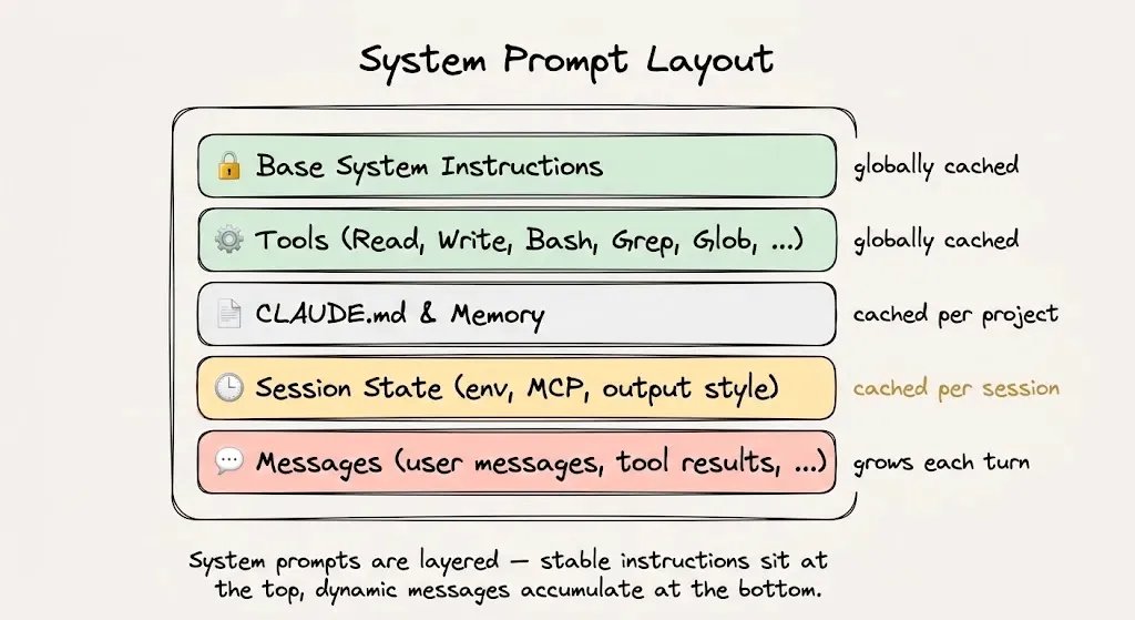 但準則在於細節。不要將時間戳記注入系統提示詞中,不要打亂工具定義,不要在中途切換模型,也不要變更快取斷點之前的任何內容。