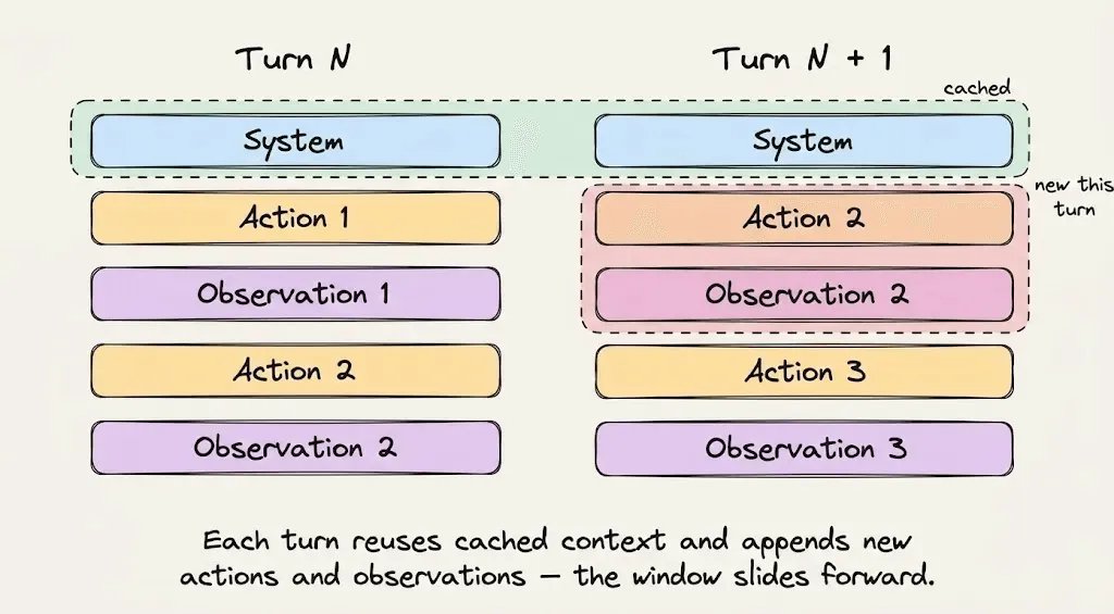 動態後綴(Dynamic suffix):隨著每個回合不斷增長的部分,例如使用者訊息、助理回應、工具輸出和終端觀察結果。