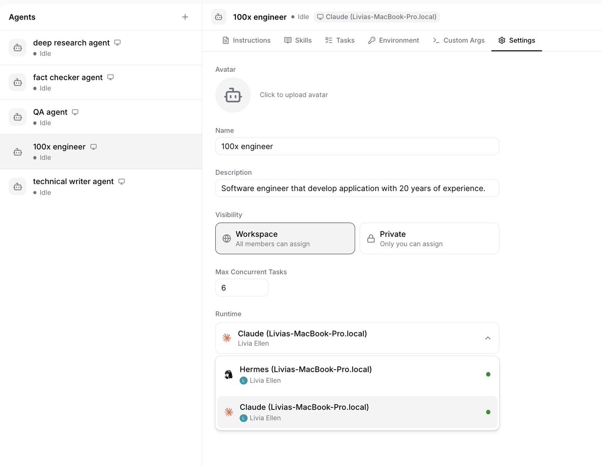 - 我可以混合使用不同的 Agent。Claude、Codex、Hermes、OpenClaw、Gemini、Pi、Cursor Agent,全部都在同一個看板上,並從同一個技能庫中提取能力。它是供應商中立的。