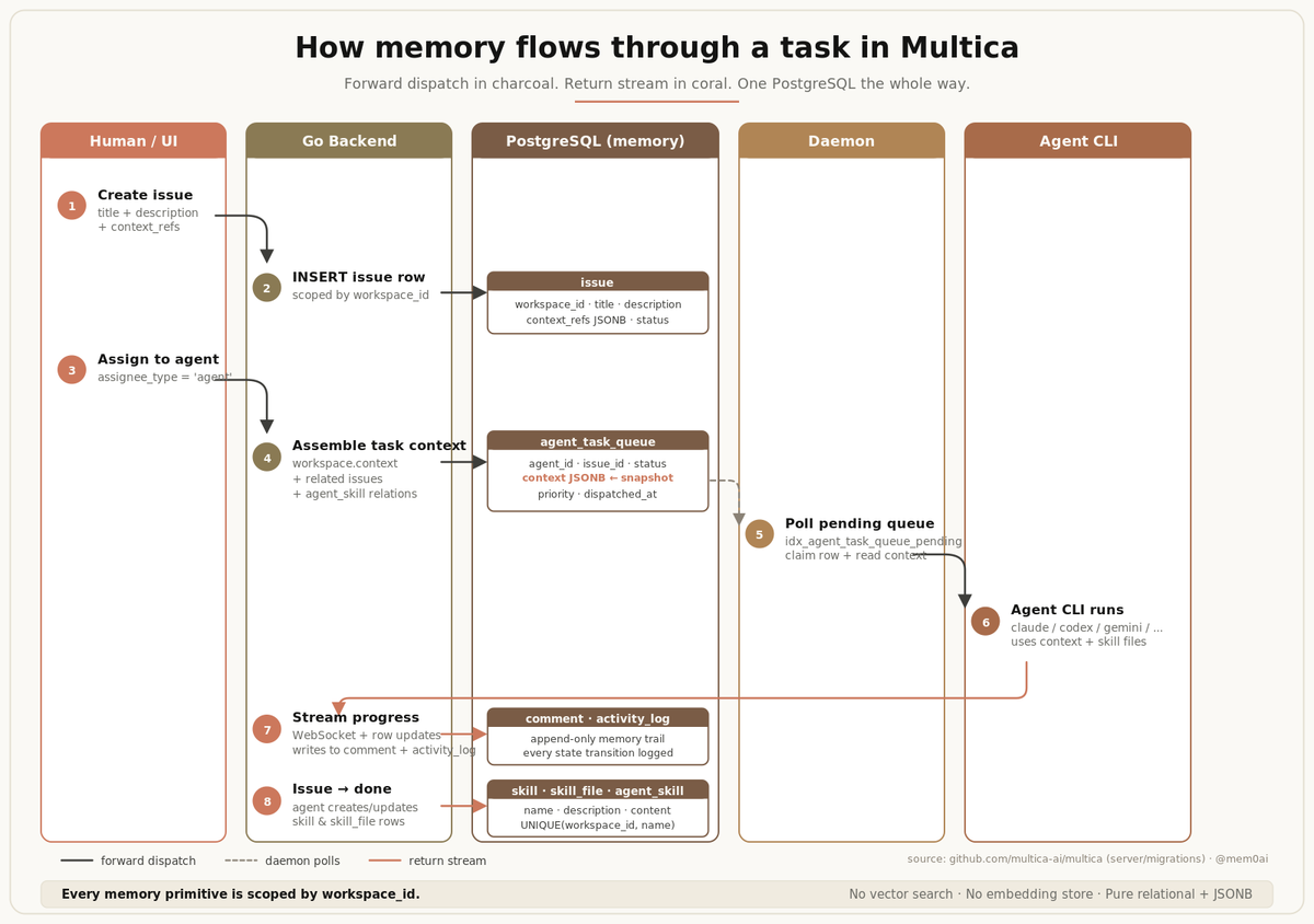 Multica 從關聯式資料庫開始做起,這點非常正確。我認為這種關聯式方法仍可與 AI Agent 記憶系統結合,為其 Agent 帶來更好的體驗。