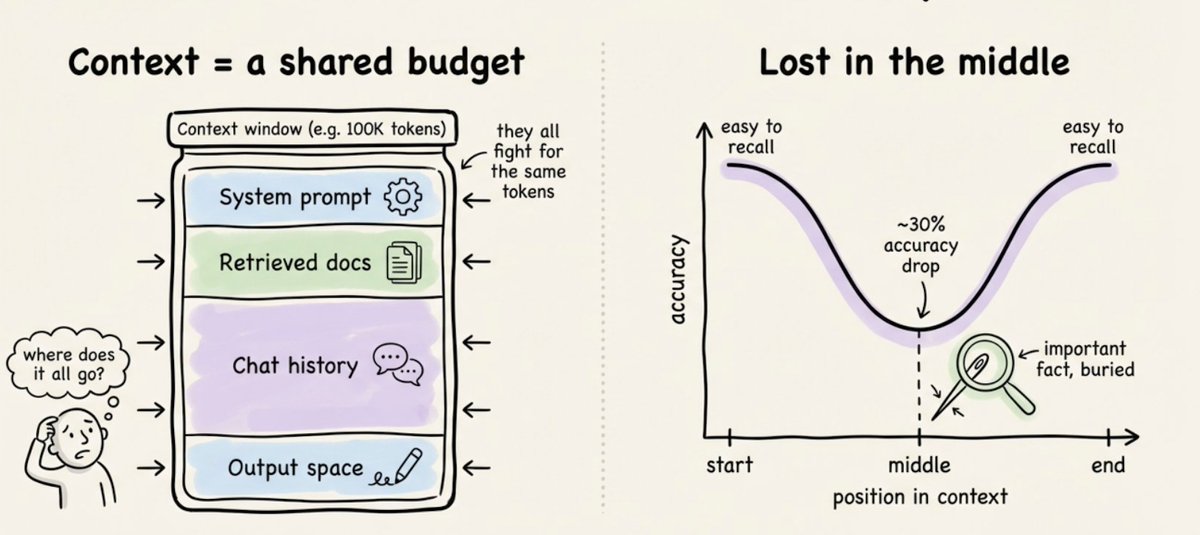 隨著 context 增加,注意力會分散在更多的 token 上。較舊、不相關的內容開始干擾當前任務,且隨著 context window 被填滿,模型的智慧程度會下降。