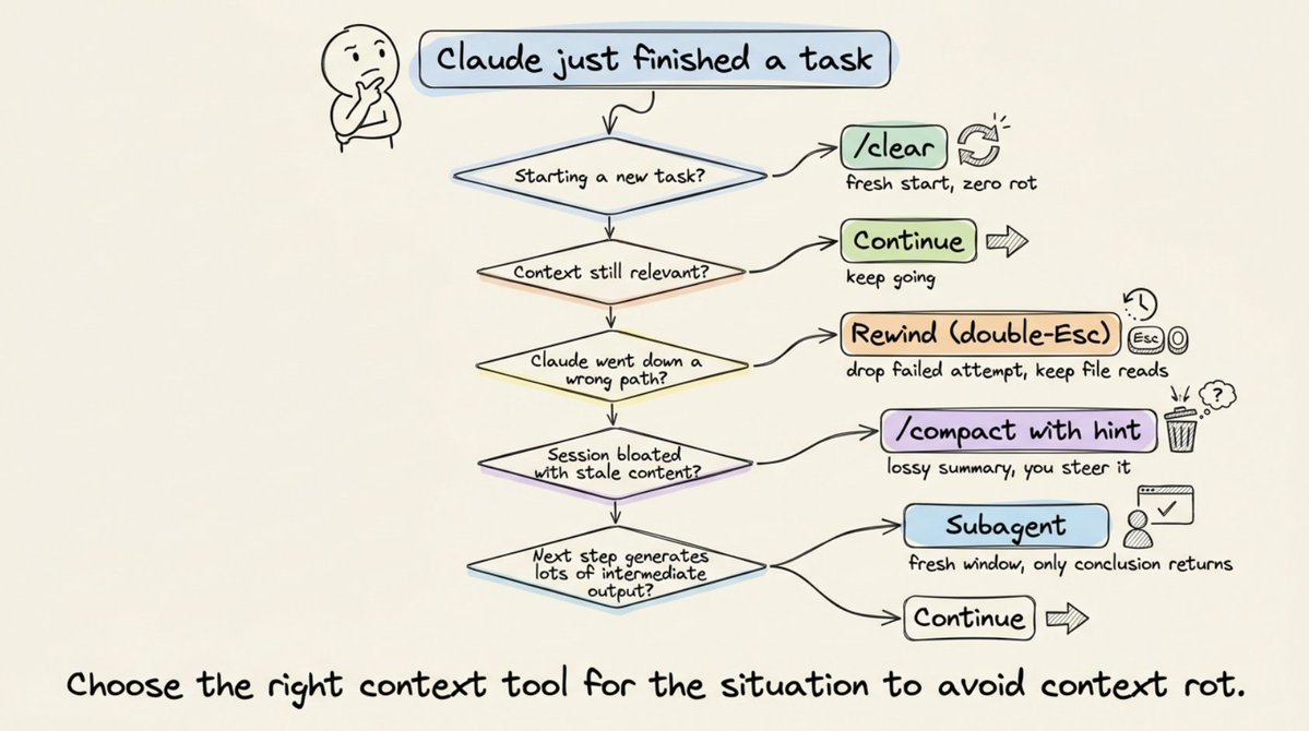 /compact 專注於 auth 重構,捨棄測試除錯部分。/clear:開始一個全新的工作階段。你自己寫下重要的內容,這樣可以獲得零腐敗與完全的控制權。