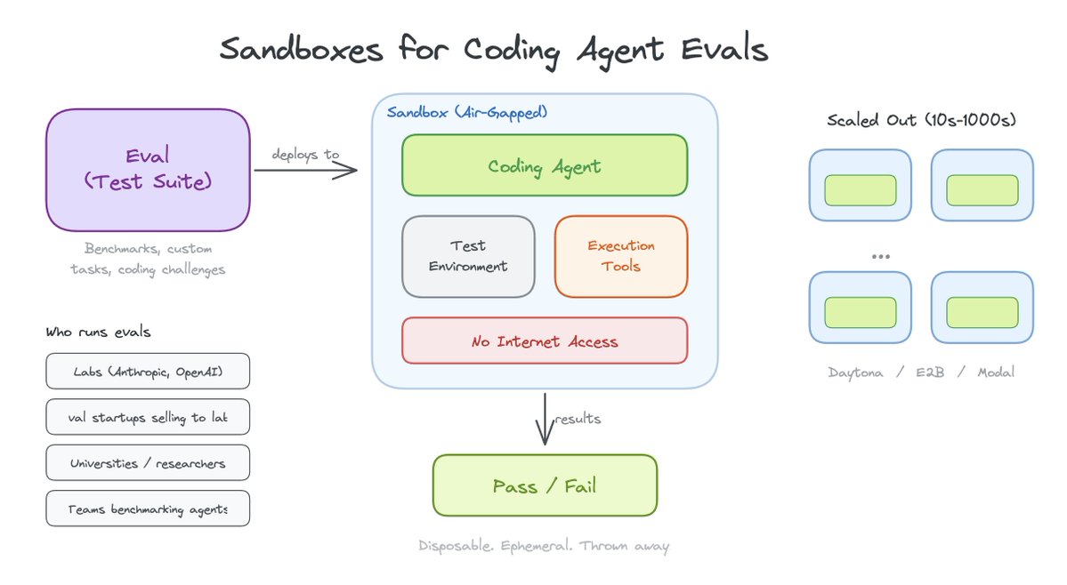 一個評測、一個測試環境,以及執行它的工具。這就是基本的 Sandbox 模式。大學、新創公司以及那些正在對自家 Agent 進行基準測試的團隊,透過 Daytona 和 E2B 等供應商,將數百或數千次的執行規模化。