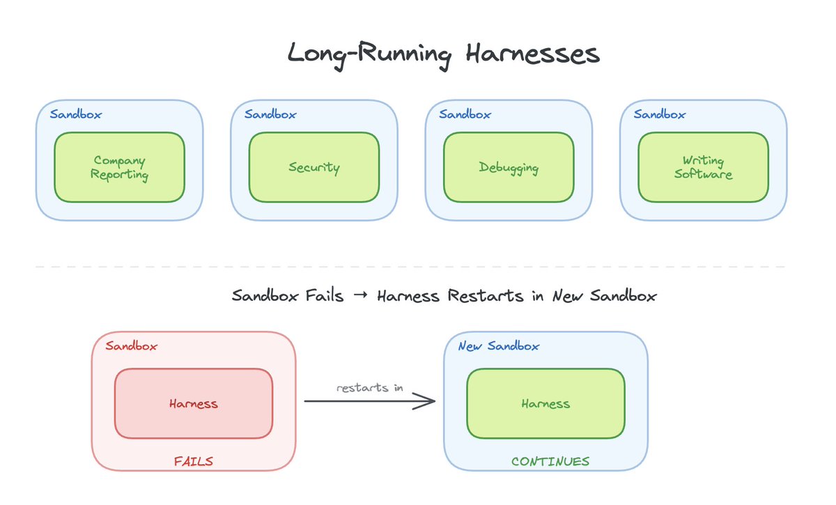 應用程式運行在伺服器上:它使用運算資源、寫入檔案系統,並在重啟後維持狀態。Harness 與 Sandbox 之間也是同樣的關係。Harness 負責推理並呼叫工具,而 Sandbox 則提供隔離的執行環境。你可以獨立替換其中任何一個,系統依然能正常運作。